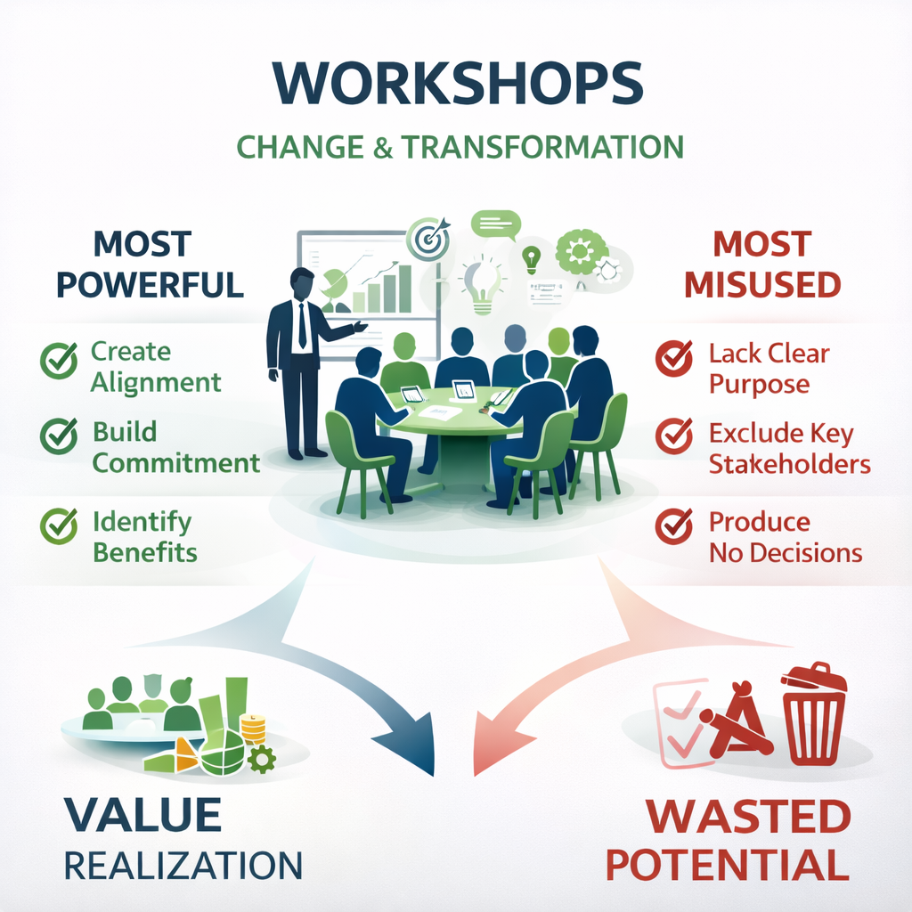 In almost every major transformation initiative, workshops appear somewhere in the execution plan. They are scheduled to gather requirements, align teams, review strategy, or discuss […]