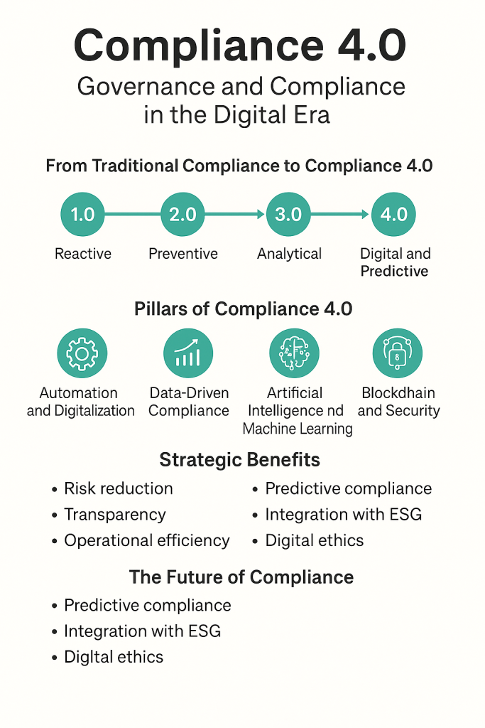Compliance is no longer just a reactive and bureaucratic function. In today’s corporate landscape — marked by technological transformation, complex regulations, and greater stakeholder scrutiny — it has become a strategic differentiator. The concept of Compliance 4.0 represents this new phase, where artificial intelligence, big data, automation, and organizational culture come together to transform compliance into a continuous, predictive process integrated with business strategy.